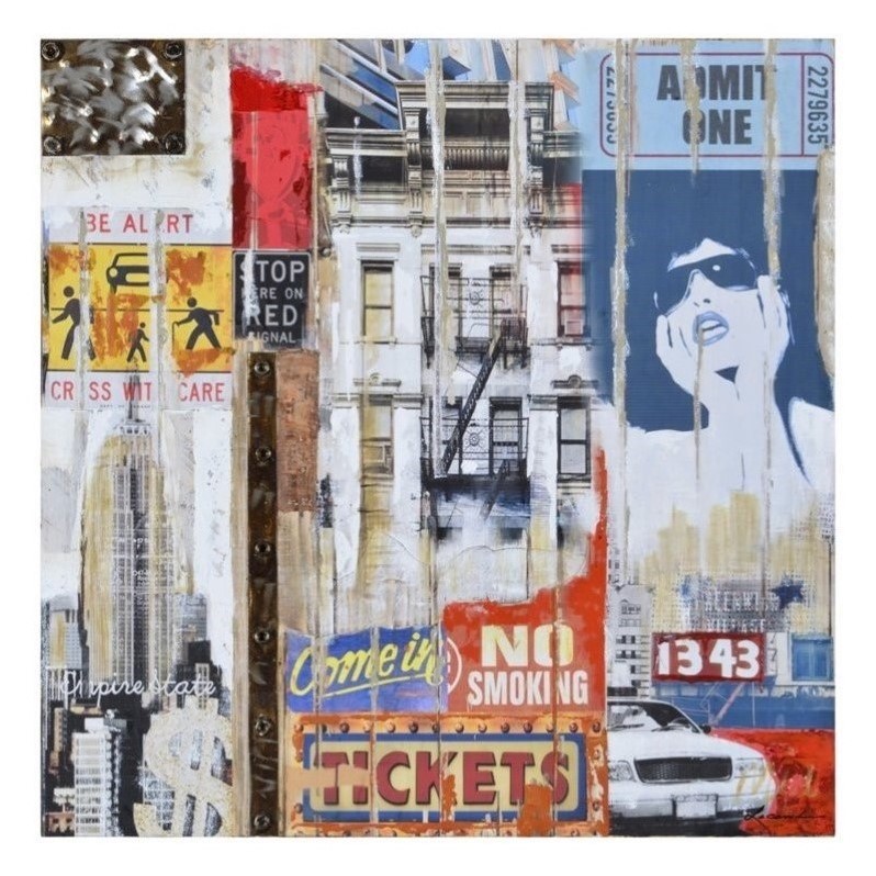 | Renwil - Wall Sculptures - W6300 - Hand painted on merged wood panels and accented with metal, this street-art inspired piece combines architectural elements with urban signs and poster-style portraits.Finish: N/AMaterial: Wood + MetalShape: SquareStyle: EclecticHanging Hardware Included: YesUnframedImportedAssembly Required: N/ASpecifications:Overall Product Dimensions: 31.5 W x 31.5 H x 2 DProduct Weight: 7.92 lbs.