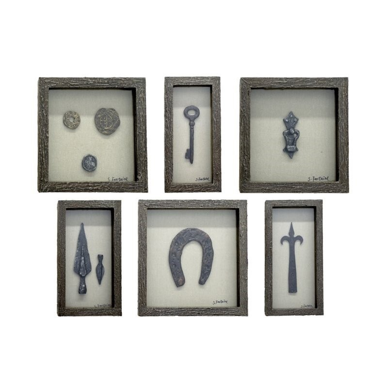| Renwil - Wall Sculptures - W6292 - This six-piece shadow box set features resin keepsakes against a backdrop of soft linen. Distressed gray frames contain a horse shoe, skeleton key, arrow heads, ornamental lock, fleur de lis and medallions. Frame Finish: Distressed GrayMaterial: MDFArtist: StephaneHanging Direction: VerticalSize: MediumHanging Hardware IncludedShape: RectangularSix Piece SetSpecifications:Large Size Dimensions: 12 X 12 X 2, 12 X 12X 2, 15 X 15 X 2Middle Size Dimensions: 19 x 10 x 2, 17'' x 10 x 2Small Size Dimensions: 15 x 8 x 2Overall Product Weight: 24 lbs