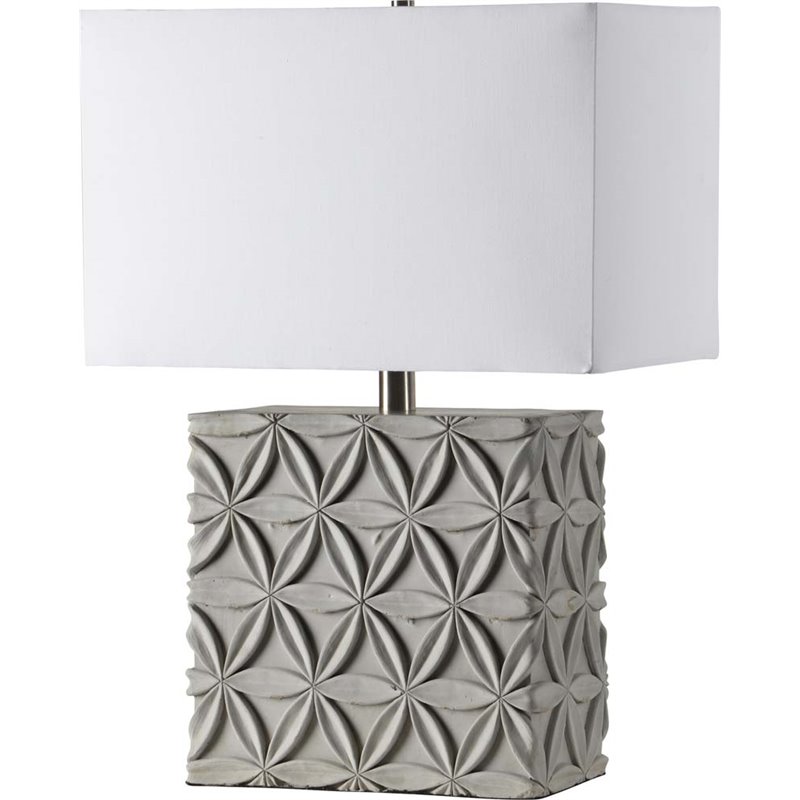 | Renwil - Table Lamps - LPT720 - Old world elegance and artisanal craftsmanship combine to create the carefree beauty of this decorative table lamp. Each intricate petal is carefully shaped in cement and placed on the square base to create the circular garlands of a repeating floral pattern. The floral motifs add softness to bohemian-inspired surroundings, with a light gray finish and off-white square lampshade.Finish: Light Gray; Style: Bohemian; Off white T/C shade; Switch Type: 3-Way . SpecificationsOverall Product Dimensions: 21.5 H x 15 W x 9 D; Overall Product Weight: 15 lbs; Max Wattage: 100; Bulb Type: A; Bulb Base: E26; Number of Bulbs: 1.