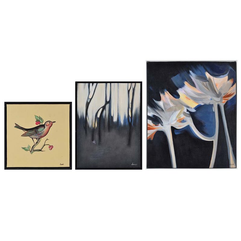 | Renwil - Prints / Paintings - OL1493 - An updated interpretation of traditional Audubon prints, this hand-painted triptych explores natural figures of flora and fauna. Captured in a combination of abstract and figurative styles, a single bird on a branch progresses to a bold blue impression of flowers, leading to figures of willowing black trees. An eclectic canvas art series for nature enthusiasts, the distinctive style of each piece turns an ordinary wall into an art museum.Style: Eclectic; Product Material: Cotton Canvas, Wood; Framed artwork; Wood frame with a Black and White finish; Rectangular format hangs vertically; Hanging hardware included. SpecificationsOverall Product Dimensions: 36 H x 30 W x 1.5 D; Overall Product Weight: 18 lbs.