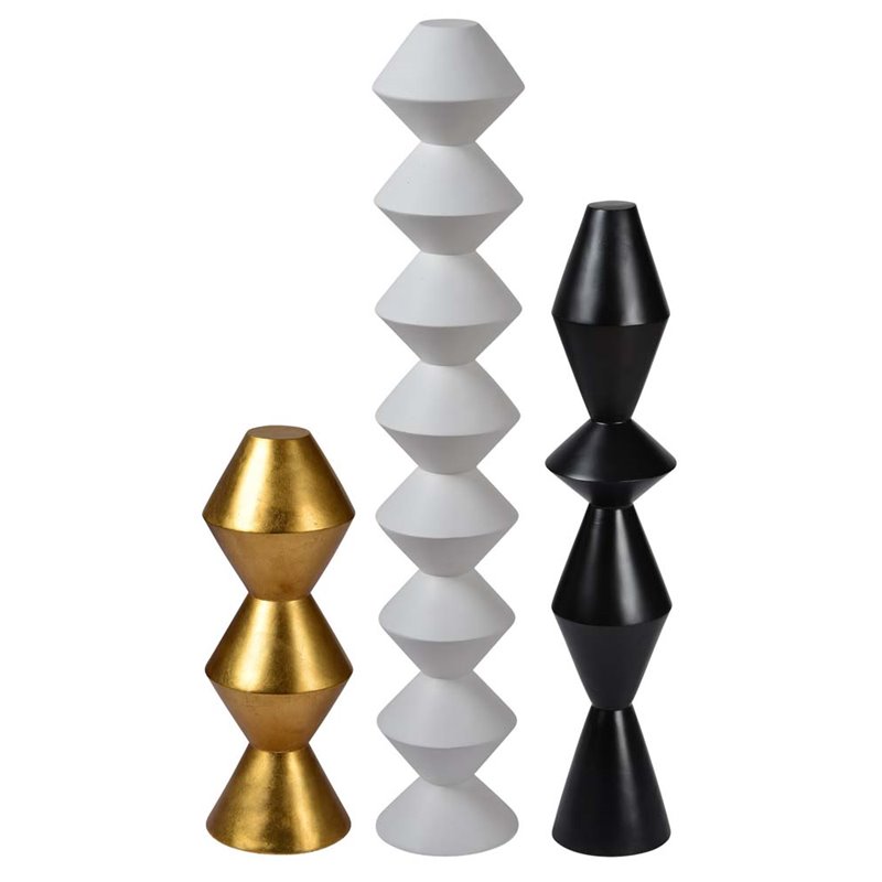 | Renwil - Statuettes / Figurines - STA456 - This geometric set of three modern statues adds creative complexity to a contemporary collection of objet d’art. Each multi-faceted silhouette is precision cast in resin to create each carefully crafted angle and edge. Featuring a modern combination of matte and metallic finishes, the small gold leaf statue sparkles beside the understated black and white sculptures on a shelf or coffee tabletop.Finish: Matte White, Gold Leaf, and Matte Black; Statue is constructed in resin. SpecificationsOverall Product Dimensions: 36 H x 8.5 W x 8.5 D; Overall Product Weight: 25 lbs.