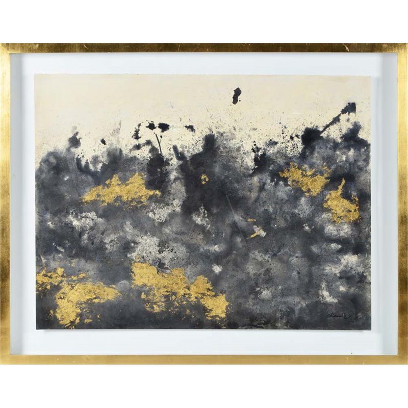 | Renwil - Prints / Paintings - W6361 - Spatters of black reach up from the void in this abstract work of decorative wall art. Shadows of black and gray are brought into the light by delicate gold leaf accents, from the painted details to the wooden frame. Floating within two panes of clear glass, the wall that you place this piece on becomes an integral part of the art itself.Finish: Gold Leaf; Style: Glamour; Product Material: Paper, Wood, Gloss, MDF; Framed wall decor; Rectangular format hangs horizontally or vertically; Hanging Hardware Included. SpecificationsOverall Product Dimensions: 38 H x 48 W x 2.2 D; Overall Product Weight: 30 lbs.