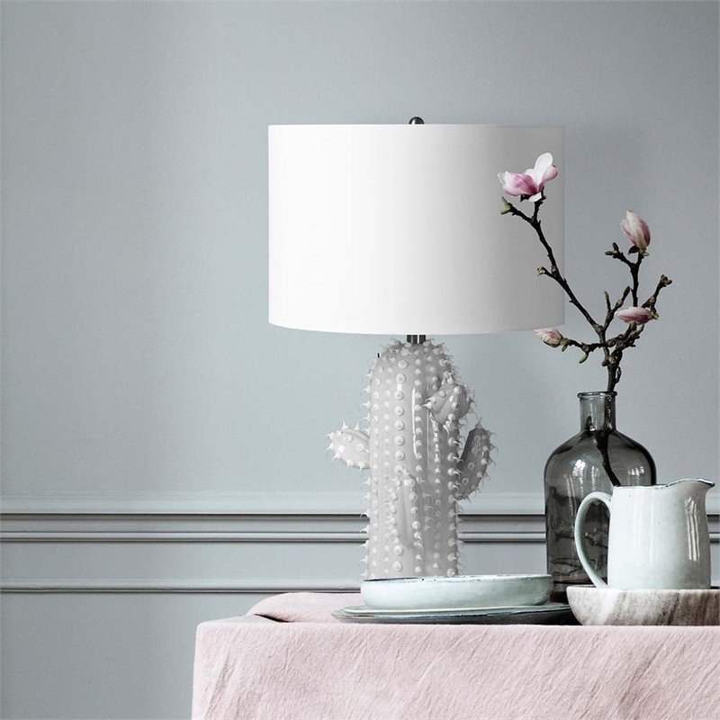 | Renwil - Table Lamps - LPT650 - Create a contemporary desertscape with the cactus shape of this modern table lamp. Part decorative accent, part Atacama-inspired light fixture, the glossy white ceramic lamp base is detailed with the pointy petals of a prickly pear. A white cotton drum shade smoothly contrasts the cacti's spiny texture. Finish: White; White Cotton shade; Switch Type: 3-Way. SpecificationsOverall Product Dimensions: 25.5 H x 15 W x 15 D; Overall Product Weight: 6 lbs; Max Wattage: 100; Bulb Type: A; Bulb Base: E26; Number of Bulbs: 1.