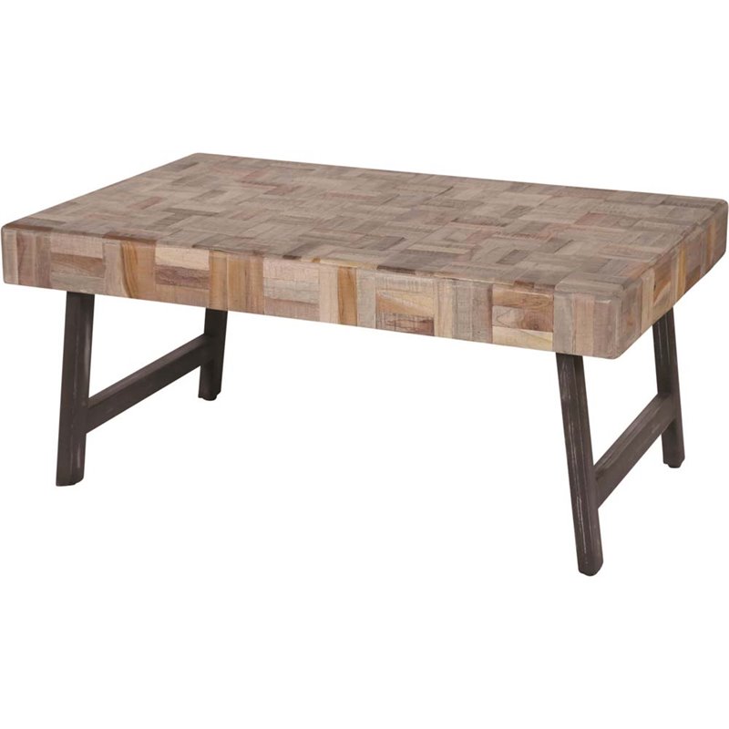 | Renwil - Coffee Tables - TA132 - The iconic butcher-block pattern gets an industrial treatment in the weathered surface of this decorative coffee table. The rectangular tabletop is artfully crafted from reclaimed teak wood and finished with a delicate tea-leaf wash to accentuate every wood grain. Supported by a slanted A-frame of black metal legs, this traditional table is an essential piece of accent furniture for every stylish city dweller.Finish: Tea Leaf and Black; Coffee Table is constructed in reclaimed teak wood and metal. SpecificationsOverall Product Dimensions: 16 H x 36 W x 22 D; Overall Product Weight: 31 lbs.