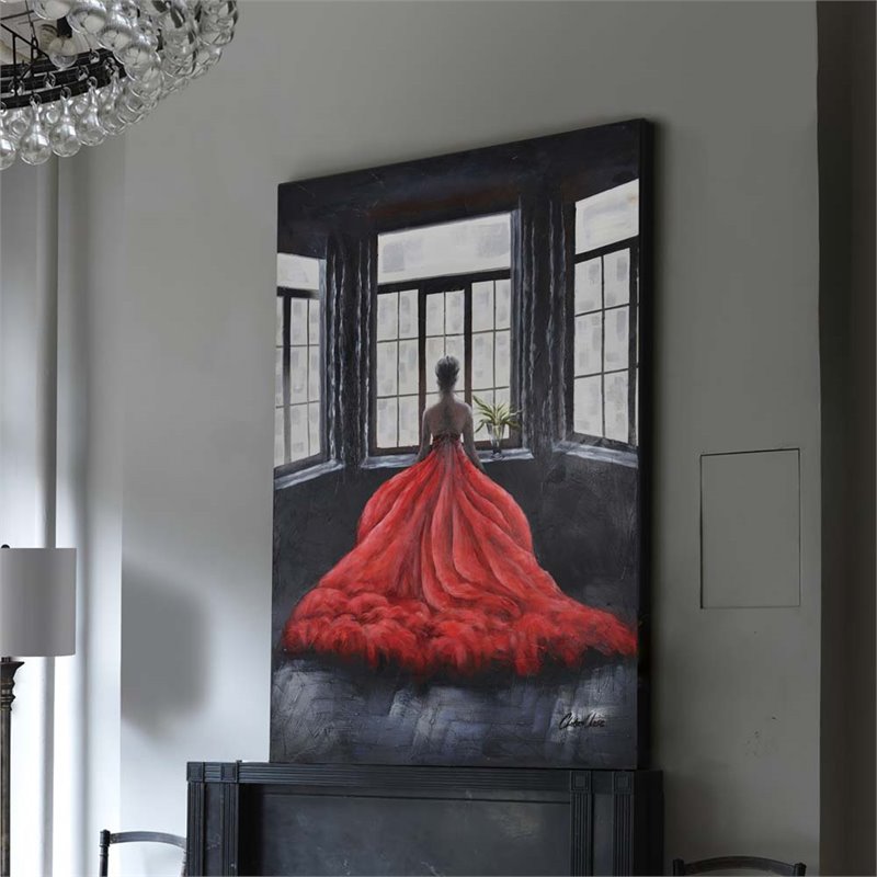 | Renwil - Prints / Paintings - OL1381 - The allure of the red dress in this figurative painting provides a provocative contrast to the muted grays and blues of the room.Product Material: Canvas and Wood; Wood frame; Hangs Vertically; Hanging Hardware Included. SpecificationsOverall Product Dimensions: 59 H x 39.5 W x 1.5 D; Overall Product Weight: 10 lbs.