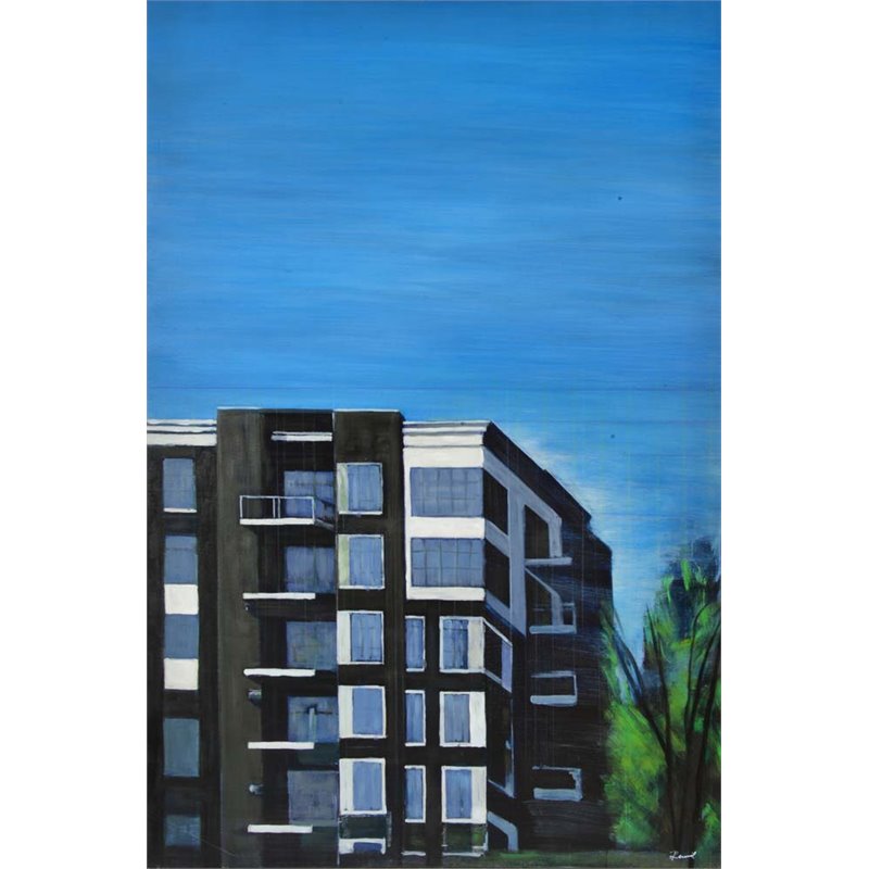 | Renwil - Prints / Paintings - OL1437 - The cosmopolitan landscape of this modern canvas art piece gives every room has a view of the city. Every angle of the black and white building is accentuated by the blue sky background, while a depiction of a nearby tree gives the condo complex a sense of scale. Printed on canvas and detailed with hand-painted accents, the glamorous impression of an uptown loft adds an element of urban architecture to city lofts and suburban walls.Style: Glamour; Product Material: Canvas; Unframed artwork; Extended edge; Rectangular format hangs vertically; Hanging hardware included. SpecificationsOverall Product Dimensions: 60 H x 40 W x 1.5 D; Overall Product Weight: 11 lbs.