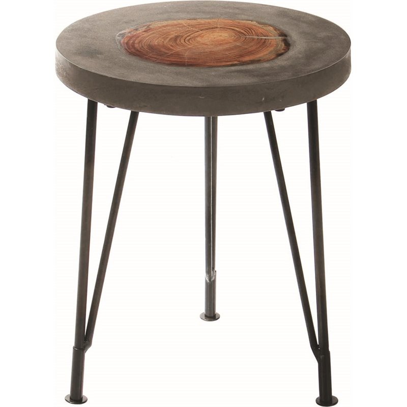 | Renwil - Accent Tables - TA122 - The rugged elegance of this traditional accent table gives industrial interiors a touch of the great outdoors. Smoothly formed concrete celebrates the distinctive crosscut grain of burl wood at the center of the round tabletop. Supported by three black metal legs, the primitive design is perfect for rustic spaces seeking a sense of refinement.Finish: Natural Wood and Concrete; Accent Table is constructed in concrete, wood and metal. SpecificationsOverall Product Dimensions: 18 H x 14 W x 14 D; Overall Product Weight: 11 lbs.