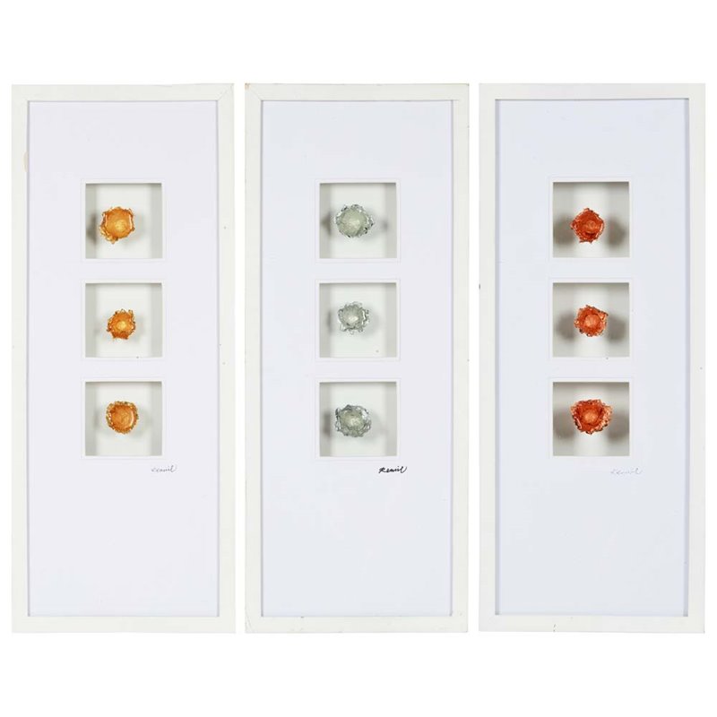 | Renwil - Wall Panels / Plaques - W6362 - Peer into the windows of abstract art with the organic forms of this modern triptych. Each of the three decorative wall art frames captures delicate flower buds Each sculptural is artfully crafted I epoxy and painted in mineral metallic shades of copper, silver and gold. Set within the shadowbox of a matte white wood frame, the delicate shimmer of each figurine adds a small sparkle against a blank wall.Finish: Matte White; Style: Glamour; Product Material: Wood; Framed wall decor; Rectangular format hangs vertically; Hanging Hardware Included. SpecificationsOverall Product Dimensions: 27 H x 11 W x 1.5 D; Overall Product Weight: 24 lbs.