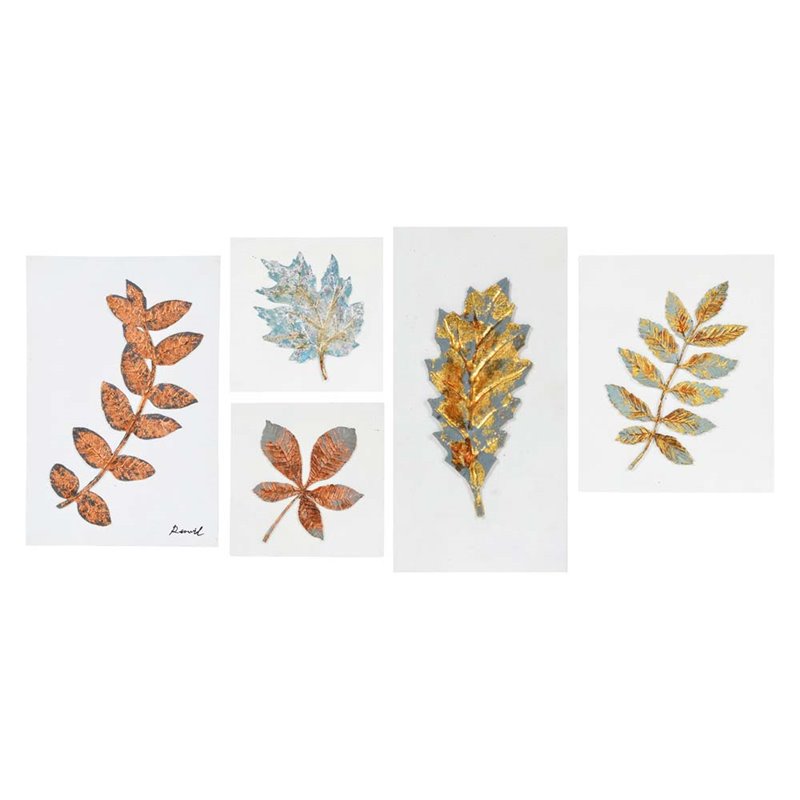 | Renwil - Prints / Paintings - W6343 - The natural inspiration behind this traditional wall decoration series explores the wonder of the great outdoors. Sold as a set of five, individual foam leaves are laser cut with precision and mounted to a wood box. Painted in varying shades of blue, the natural veining of each leaf is accentuated with copper, silver and gold leaf accents, bringing a metallic luster to each frond. Style: Traditional ; Product Material: MDF, Resin; White edge; Unframed wall decor; Rectangular format hangs vertically; Hanging Hardware Included. SpecificationsOverall Product Dimensions: 18 H x 12 W x 1.5 D; Overall Product Weight: 7 lbs.