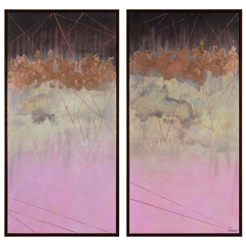 | Renwil - Prints / Paintings - OL1466 - An artistic exploration of the transition of time, this set of two canvas art pieces uses shape and color to capture the moment. Midnight fades to morning in an atmospheric color palette of pink, beige and black as faintly sketched triangles traverse the vertical canvas. Each piece is surrounded by a bronze frame and features the inverse of the canvas beside it, hung on a wall in perfect harmony.Style: Scandinavian; Product Material: Canvas; Framed artwork; Polystyrene frame with a Bronze finish; Square format hangs vertically; Hanging hardware included. SpecificationsOverall Product Dimensions: 48 H x 24 W x 1.5 D; Overall Product Weight: 11 lbs.