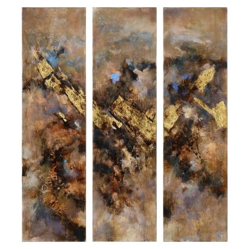 | Renwil - Prints / Paintings - OL1356 - Gold accents in the foreground of this three-panel painting create a striking triptych. The powerful strokes of brown combined small blue inflections result in a contemporary art piece that's anything but ordinary. Finish: N/AMaterial: Canvas and WoodShape: RectangularHanging Hardware IncludedUnframedStyle: TraditionalConfiguration: VerticalResidential/CommericialSpecifications:Overall Product Dimensions: 16 W x 60 H x 1.5 DProduct Weight: 18.2 lbs.