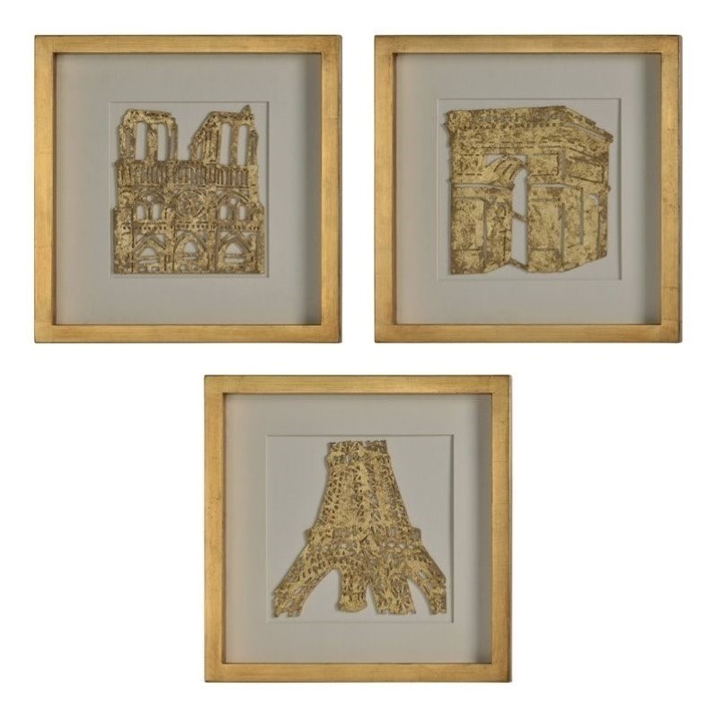 | Renwil - Wall Sculptures - W6283 - This wall art series features historical Parisian landmarks suspended in glass and surrounded by distressed gold frames. Foam carved and accented in gold leaf, the three-piece set includes the Arc de Triomphe, the Eiffel Tower and Notre Dame Cathedral.Finish: N/AMaterial: Foam + WoodShape: SquareStyle: ModernHanging Hardware Included: YesFramedImportedAssembly Required: N/ASpecifications:Overall Product Dimensions: 16.5 W x 16 H x 1 DProduct Weight: 13.6 lbs.