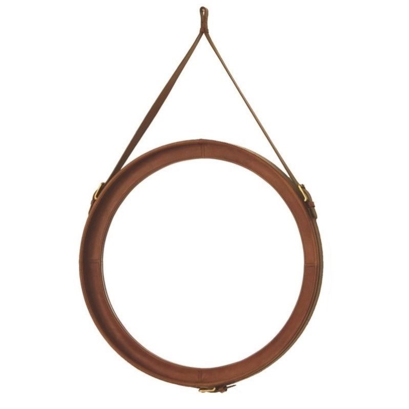 | Renwil - Accent Mirrors - MT1525 - Inspired by equestrian style, this round hanging wall mirror features a light brown leather frame with matching leather strap.Finish: Light brown leatherMaterial: 100% Upholstery Leather with MDFShape: RoundResidential/CommericialHanging Hardware IncludedFramedDistress Finish: NoStyle: EclecticSpecifications:Overall Product Dimensions: 24 W x 24 H x 1 DProduct Weight: 9.25 lbs.