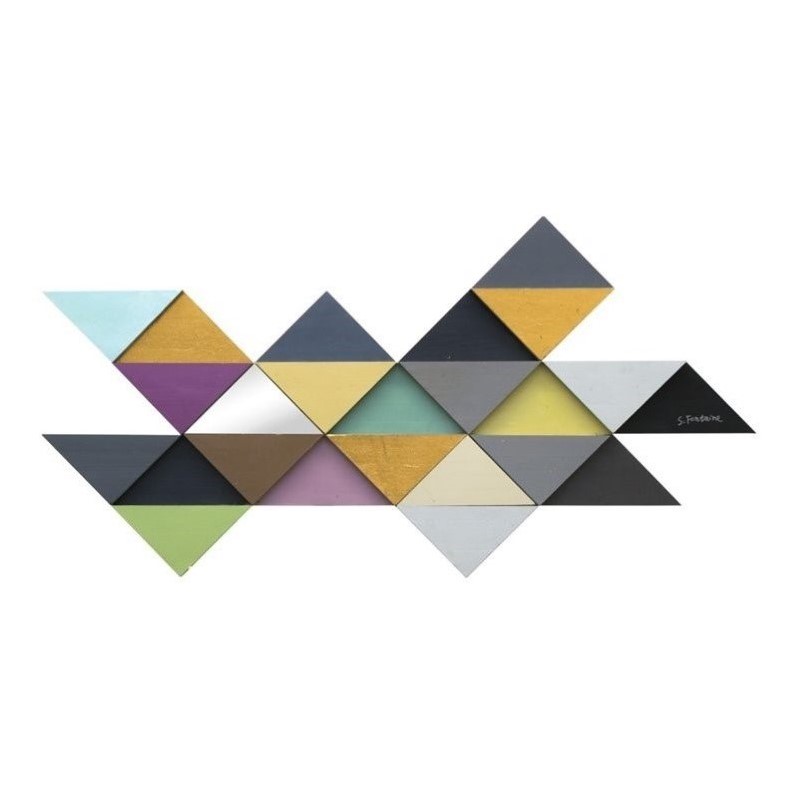 | Renwil - Wall Sculptures - W6287 - This modern mixed-medium wall art piece combines vibrant pastels with metallic and mirrored wedges. The triangles also vary in thickness, taking the geometric design to another dimension.Finish: N/AMaterial: Wood + GlassShape: N/AStyle: ModernHanging Hardware Included: YesUnframedImportedAssembly Required: N/ASpecifications:Overall Product Dimensions: 56 W x 29 H x 1.5 DProduct Weight: 15 lbs.